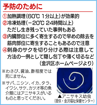 金沢福祉保健センターの有竹義男さんは「活きの良い魚が市場に出回る時期に多く発生する食中毒。自分で釣った魚で発生する例もある」と話し、金沢を含む海岸沿いの区で特に発生が増えていると警告している。