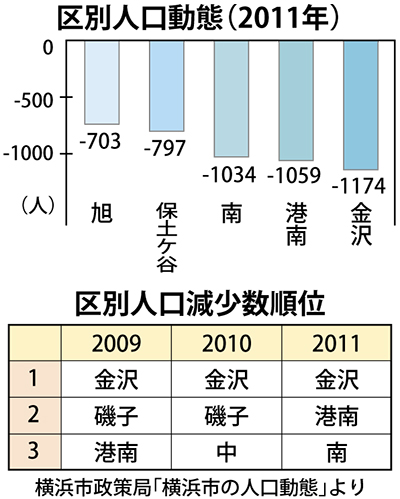 横浜市が3月に発表した2011年度の人口動態で、区内人口は1174人(0・56%)減の20万7795人となり、減少数・減少率とも3年連続で市内最大となった。区の推計を上回るスピードで人口減少が進んでいる現状が浮き彫りになった。