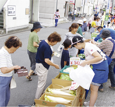 町屋学校通り振興会(中井章会長)は9月16日、金沢小学校前で恒例の朝市を開催した。鮮魚や米、寿司、コーヒーなど、商店街各店が商品を格安で販売。朝早くから多くの人で賑わった。