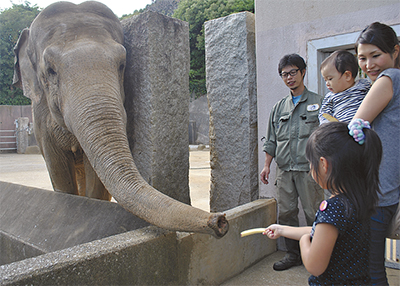 エコ森教室「おイモを掘ってゾウにあげよう」が10月20日、金沢動物園で開かれた。これは、動物園職員がゾウのフンを堆肥に利用して育てたサツマイモを、再びゾウにプレゼントするイベント。参加した親子約80人は、サツマイモを掘った後、インドゾウのヨーコに自分の手でイモを与えた=写真=。子どもたちはゾウの大きさに驚きながらもエサやりを楽しんだ。