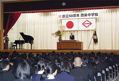 西柴中学校の創立50周年を祝う記念式典が、10月27日に行われた。当日は学校関係者や地域の人など約90人が招かれ、50周年を祝った。