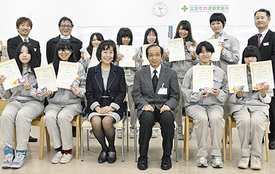 区内企業の山陽印刷(福浦)は、神奈川県立産業技術短期大学校(旭区)の2年生と協力し、18歳〜22歳前後の若者をターゲットにした名刺を企画・製作した。11月16日、秋山桂子社長らが同校を訪問。デザイン製作に挑戦した学生12人を表彰した。参加した学生には、賞状とともに自分がデザインした名刺が贈られた。式後、早速名刺交換をする学生の姿が見られた。