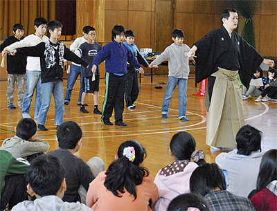 金沢区が主催する「出張能講座」が11月29日、小田(こだ)小学校で行われ、能楽師の櫻間右陣さんが講師を務めた。この日は金沢区にゆかりのある「六(むつ)浦(ら)」と「放(ほう)下(か)僧(そう)」を題材に、6年生約124人が能を体験した。