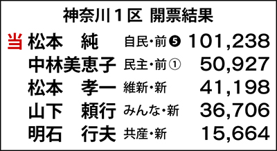 衆議院議員総選挙の投開票が12月16日に行われた。自民党が単独過半数を獲得する圧勝の中、前職・新人の5人が争った神奈川1区(金沢区、中区、磯子区)は、自民党の前職・松本純氏(62)が2位中林氏に5万票の差をつけ、5度目の当選を決めた。