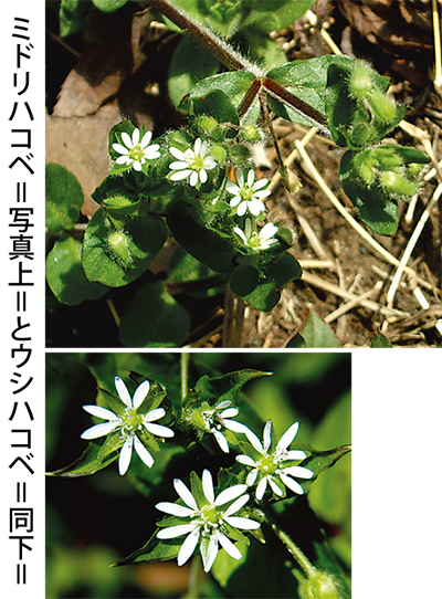 ハコベという種(しゅ)はなく、ハコベ類の総称で、区内には在来種のミドリハコベとウシハコベ、そして外来種(帰化植物)のコハコベとイヌコハコベの4種があり、明るい道端、公園、土手等で普通にみられます。