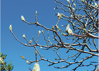 北国で春を告げる花「コブシ」は、モクレン科の樹木で、金沢区内では公園・街路樹・庭木として多く植栽されています。この時期、蕾(つぼみ)は日一日と膨らみを増し、今か今かと春を待っているかのようです。蕾は少しの温度差に敏感で、陽の光をいち早く受け、春の暖かな日差しにより南側の部分が先に膨れ、その反動で、蕾の先端は反対側(北側)へ反り返ります。よって蕾の先端のほとんどは常に北向きになります(環境により異なることあり)。こうした植物を「コンパス・プラント(方向指標植物)」といい、ヤナギ類も同じです。