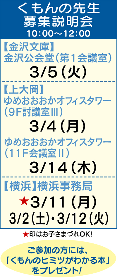 くもんは、子どもたちの「基礎学力」と「自学自習力」向上を目指した学習法。多くの子どもたちとの出会いから自らも成長できる仕事です。あなたもチャレンジしてみませんか?お気軽にお問合わせ下さい。未経験の方でも各種援助制度や研修制度が充実しているので安心して開設できます。まずはお近くの説明会にご参加下さい。(50歳までの女性)