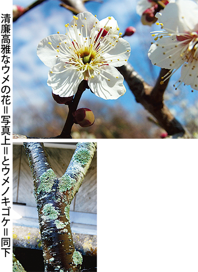 古木のウメには、写真のようなコケ状のものが付着しているのを見かけます。これは「ウメノキゴケ」という藻類と菌類が共生している地衣類で、コケではありません。日本には約80種のウメノキゴケがあり、大気汚染に対して敏感で、大気のきれいなところほどよく生育します。このような植物を「環境指標植物」といいます。