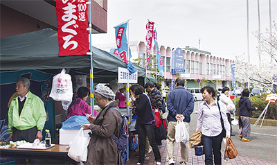 当日は、会員企業によるアウトレット品販売のほか、三浦・三崎のまぐろ、春野菜なども出品され、多くの客で賑わった=写真。