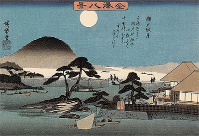 鎌倉時代、称名寺ができると、鎌倉との往来も多くなり、ここに橋が架けられました。この「瀬戸橋」は日本最古の海上架橋といわれています。江戸名所図会では、橋の下を流れる急流と、瀬戸橋の賑わいがうかがわれます。「金沢八景」の一つには「瀬戸秋月」がうたわれ、広重の浮世絵にも瀬戸橋にかかる秋月が描かれています。