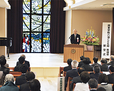 関東学院六浦こども園の新園舎献堂式が3月30日、同園の「いのりのホール」で行われた。式には学院や工事関係者をはじめ、林琢己金沢区長ら約200人が出席。新しい園舎の完成を祝った。