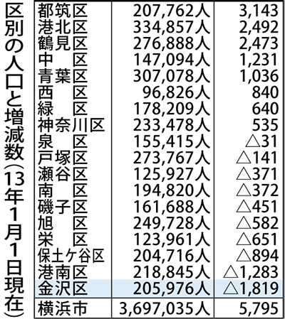 区別にみると、3143人増加した都筑区が最多。次いで港北区・鶴見区・中区・青葉区・西区・緑区・神奈川区の7区が増加した。一方、減少したのは10区。1819人と最も減少した金沢区をはじめ、港南区・保土ケ谷区・栄区・旭区・磯子区・南区・瀬谷区・戸塚区・泉区が続く。
