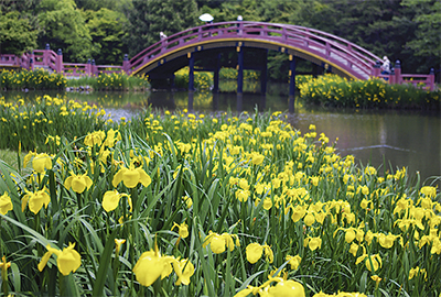 称名寺(金沢町)では、アヤメの一種「キショウブ」が満開に。鮮やかな黄色の花びらが、阿字ヶ池の周りを埋め尽くした=写真、5月10日撮影。