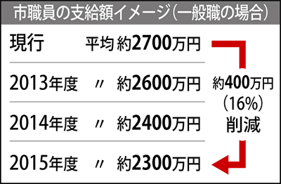 現在、横浜市では一般職員が退職する際、最大で給与月給の約59カ月分(2700万円)が支払われているが、改正案ではこれをまず今年8月から約56カ月(2600万円)に引き下げる。さらに2014年度には約52カ月(2400万円)、2015年度には約50カ月(2300万円)に減額。同時に市長や副市長といった常勤特別職の退職手当も現行よりも最大で13%程度引き下げるとしている。削減幅(約400万円)については、国が示したモデルケースとほぼ同じ水準。市では、この措置で2015年度には約26億円の人件費の削減効果を見込んでいる。
