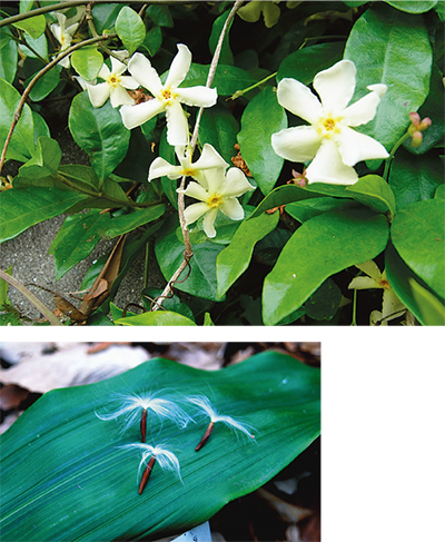 テイカカズラは、山林や公園等の樹木に絡みつく蔓植物で、区内では普通に見られ、園芸種にも改良され、庭木として見ることができます。花の白い5弁花が捻れて風車状になり、甘い香りを漂わせ、特に夜強く香るので、夜活動するスズメガが花粉の媒介者になります。花は白から黄色へと色変わりします。果実は2本の細長い20〜25cmの莢(さや)状になり、熟すと裂けて中からタンポポの種子に似た可愛らしい種子が飛び出し、風に運ばれていきます。