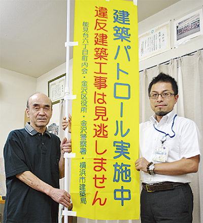 金沢区能見台六丁目町内会(千坂宗行会長)に6月19日、横浜市建築局違反対策課から「建築パトロール実施中」と書かれたのぼり旗40本が贈られた。