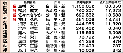 参議院議員選挙の投開票が7月21日に行われた。4議席を11人が争った神奈川選挙区では、自民党の新人・島村大氏(52)が約113万票を獲得し、トップ当選。以下、みんなの党の新人・松沢成文氏(55)、公明党の新人・佐々木さやか氏(32)、民主党の現職・牧山弘恵氏(48)と続き、全国と同様に自民、公明の与党が強さを見せた。