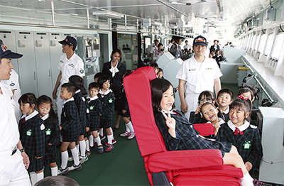 見送りの会後は、しらせの艦内を乗員の案内で見学。長い航海に備えて艦内にある散髪スペースや、格納されたスノーモービルに驚きの声を上げていた。園児は「大きくて楽しかった」「艦長席に座った」「小さな船(救命艇)があった」など興奮した様子で感想を話していた。日高艦長は「子どもに見送ってもらえることは励みになる。長い航海の出発前に元気をもらった」と笑顔で感想を語った。