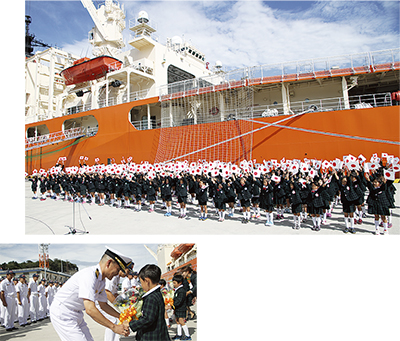 並木幼稚園と姉妹園の野庭幼稚園(港南区)の年長園児197人は、海上自衛隊横須賀地方総監部岸壁に係留中の砕氷艦「しらせ」を10月9日に訪れ、南極観測に向かう航海の安全を祈る見送りの会を開いた。