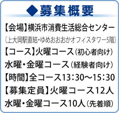 会場は上大岡駅直結の横浜市消費生活総合センターで、対象は概ね50歳から70歳。初心者向けにマウスの使い方から学ぶ火曜コースと、多少経験のある人向けにワードやエクセルを中心に学ぶ水曜・金曜コースの3コース。期間は1、2年で、デジカメ撮影会など校外での活動も活発だ。