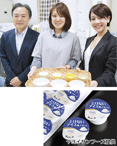 昨年春に関東学院大学を卒業した女子学生3人が開発し、卒業論文にまとめた「溶けないアイスクリーム」が商品化された。20度から25度の常温で1時間放置しても溶けないアイスは、特に集団で食事をとる施設や「介護食」に最適。昨年8月の発売以来、学校や病院、高齢者施設などで約40万食が提供されている。