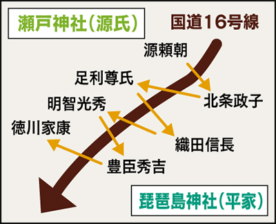 北条政子は源頼朝の妻とはいえ、平家の流れ。瀬戸神社を「源氏」、琵琶島神社を「平家」とみた場合、その後の天下の流れが、この両神社を交互に「おわたり」しながら受け継がれているかのように見えてきます(図参照)。