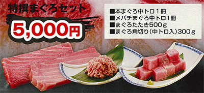 3500円から10000円まで各種セットがある。売れ筋は5000円の品=写真。本まぐろとメバチまぐろの中トロ冊、たたき、角切りとまさに”まぐろづくし”。美味しさを余すところなく味わえる。数量限定となるが銀ダラ西京漬けのセットも用意している。