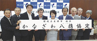 金沢区役所や京浜急行電鉄、横浜八景島など8者間で7月23日、「環境未来都市 横浜”かなざわ八携協定”」が締結された。地域温暖化や少子高齢化などの社会的課題を解決するため、鉄道事業者、地域、企業、大学が連携協力を約束した。