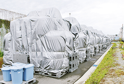 金沢区にある南部汚泥資源化センター(幸浦)には、約2万4400トンの汚泥焼却灰が保管されている(11月末現在)。埋め立て凍結で行き場を失った汚泥焼却灰が、敷地内の道路上にもあふれている状況だ。こうした保管量が増え続ける事態は解消される見通しだが、3月以前の約2万1500トンは当面、現況のまま保管するという。