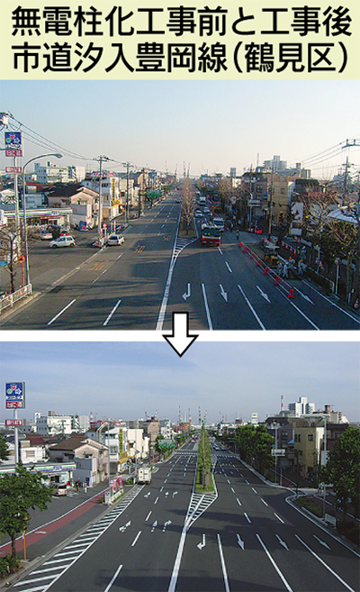 無電柱化は景観の向上やバリアフリー化の推進のほか、地震などの災害時に電柱が倒壊する危険がなくなり、防災対策になる。