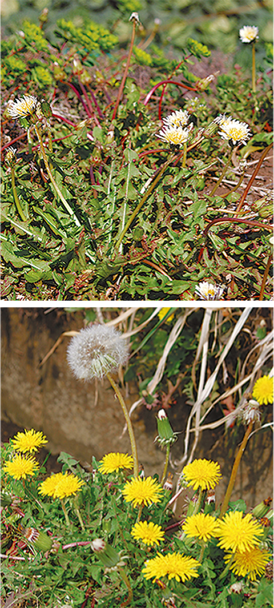 確かに戦前の関東周辺では、在来種・外来種問わずほとんどが黄色い花で、西日本では逆に白花が多く生育していました。今では市内でも稀に白い花(シロバナタンポポという別種)を見かけることがあります。