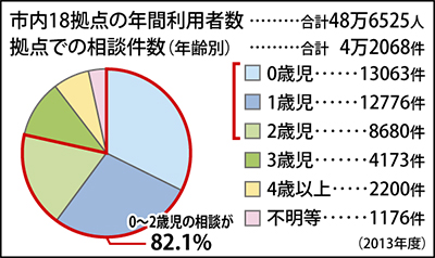 全市的な事業開始に先駆け、すでに神奈川区の地域子育て支援拠点「かなーちえ」では今年2月からモデル事業を実施。横浜市内18区にある拠点の年間利用者数は約49万人(13年度)。拠点での相談件数は4万件を超え、そのうち82・1%が0〜2歳児の保護者だ。
