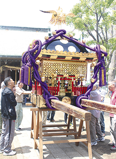 宮神輿の台輪寸法は3尺8寸5分。祭りでは約100人で担いでいるという。昨年9月に宮惣へ依頼し、8カ月かけて修繕が行われた。本体の漆塗りのほか、彫金の飾り物なども新たに施された。