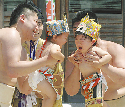 それぞれまわしをつけた赤ん坊は、東京農業大学相撲部の力士に抱えられて土俵入り。行司が驚かすと、大きな声で、元気よく泣いていた。