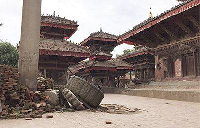 寺院や遺跡が集まる世界遺産、首都・カトマンズのダルバール広場で見たのはがれきの山だった。屋根や塔部分が崩れ、土台のみが痛々しく残る歴史的建築物。「大切な財産が失われてしまった」。カトマンズを拠点に東側から西側まで数々の寺院や村を訪れたが、いまだがれきの山が広がり復旧作業が進んでいない現状をみた。「シャベルや荷車でがれき除去をしている状況」。普段なら観光客で賑わうヒマラヤ山脈の玄関口も閑散としていた。
