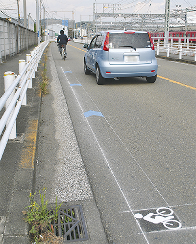 今回設置された表示は、自転車専用通行帯を表す帯状の路面表示と違い、自動車と自転車が混在する空間であることを示す。車道走行はあくまで推奨で、歩道を走行しても違反にはならない。土木事務所は「(表示設置で)運転者や歩行者の安全が少しでも向上すれば。皆さんにはルールを守り、安全走行を心がけてほしい」と話した。