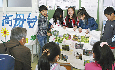 3年生のテーマは地元「高舟台」。「町たんけん」(総合、社会科)や「わたしのまちのよさ」(道徳)などの授業を土台に、それぞれが興味をもって取り組みたい課題を選択。本やインターネットを利用し、調べを進めた。発表方法もクイズ形式や紙人形を使ったものなど様々で、「より分かりやすく伝える」ための工夫が見られた。