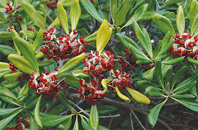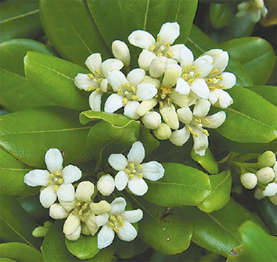 トベラは、暖かい沿岸地方の明るい山林に生育する常緑低木で、4〜6月に芳香のある白い花を咲かせ、後に淡黄色に変わります。枝葉を切ると独特の悪臭を発散し、鼻が疼(うず)くため、節分の日には、トベラとヤツデ(またはヒイラギ)の葉と枝を扉に挟んだり、火にくべて燃やしたりして、鬼を追い払いました。ここから「扉の木」つまり「トベラ」と呼ばれるようになり、学名にも”tobira”と記されています。
