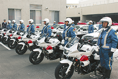 金沢警察署で1月26日、「横浜エリアゼロ対策」の出発式が行われた。白バイ7台とパトカー5台が同署を出発し、区内を巡回。指導取締りを行った。