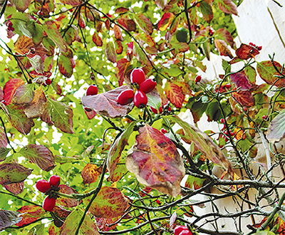 花には花弁状をした白い4枚の総苞片(萼片の一種)があり、中央に固まっている淡緑色の部分が花序になります。秋になると、楕円状の赤い果実が数個つきますが、熟しても苦くて食用には不向きです。