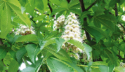 花は雄花と両性花(雌蕊雄蕊両方ある花)が混生した円錐形の大きな花序で、一斉に開花し遠くからでもよく目立ちます。近づくと甘い香りが漂い、様々な昆虫が訪れますが、その中でもトチノキは、マルハナバチの仲間を確実に招き、しっかり花粉を運ばせる工夫をしています。トチノキの雄花は花序全体に咲きますが、両性花は花序の下半部に多く咲き、花弁の斑点は、始め黄色で後に赤く変わります。蜜は黄色の斑点がある若い花の時のみ出ます。マルハナバチは色の識別ができるので、蜜が出ているときだけ訪れます。トチノキは確実に花粉を運んでくれるマルハナバチを、ご贔屓しているわけです。しかも訪れるときには、花序の下半部にドーンと大きく揺らし着地するため、他の昆虫を遠ざけてしまいます。そしてゆっくり蜜を吸いながら上部へ登っていき、花粉をつけて天辺から飛び立ち、次の花へ移動します。