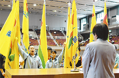 市内146校の各運動部の部長が一堂に会したこの日、生徒を代表し、東山祐汰さん(六角橋中柔道部)と濱田夕希乃さん(六角橋中陸上競技部)が「応援してくれた感謝を忘れず、自分と仲間を信じ、失敗を恐れずに全力で戦い抜きます」と宣誓。大会会長の岡田優子教育長は「感謝が伝えられる謙虚なリーダーとして、大きな事故や怪我をしないようルールとマナーを守って大会を支えてほしい」と呼びかけた。