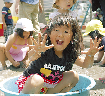金沢さくら保育園の園庭が6月4日、一面どろ遊び場に変身した。これは同園と金沢区子育て支援拠点・とことこが共催で初めて実現した育児講座。「親子でどろんこ遊び」と題し、地域の親子30組85人が参加した。「外遊びの楽しさを伝えたかった」と長門久美子園長。「特にパパに子育ての楽しさを知ってほしくて企画した」と話す。裸足になった参加者は、水を撒いたり、泥で山や団子を作ったりと泥だらけになって遊んだ。