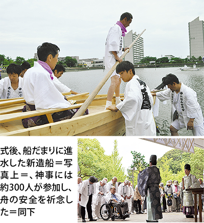 富岡八幡宮(富岡東)に800年以上も前から伝わる神事「祇園舟」の奉仕舟が80年ぶりに新造され、6月19日に進水式が行われた。当日は祇園舟保存会会員や地元住人ら約300人が参加し、新しい舟の安全を祈念した。