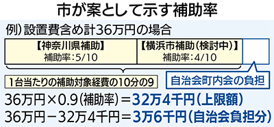 市が市民に説明した資料によると、補助は神奈川県の制度も上乗せされて行われる。補助率は県が10分の5、市が10分の4を補助し、残りの10分の1を自治会が負担する(詳細別表)。上限額は32万4千円。