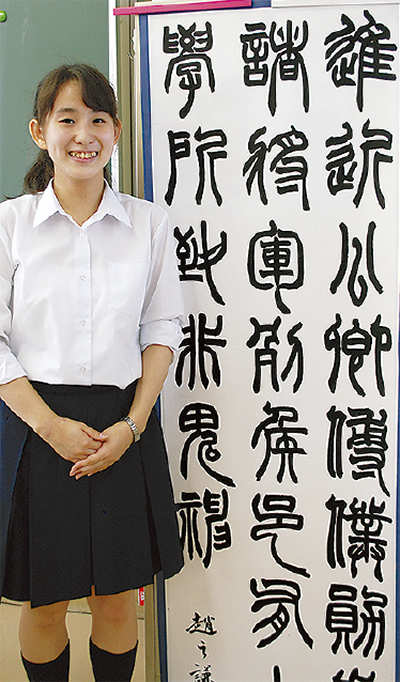 千徳真由さんの篆書の作品は昨年1月、神奈川県で最高位の教育長賞を受賞。7月30日(土)から8月3日(水)まで広島県で開かれる全国高等学校総合文化祭の書道部門に出展される。「ずっと見続けていたい大好きな書。(全国は)すごく嬉しい」と笑顔を見せる。