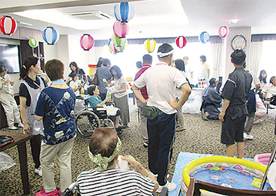 54人の入居者に対し、夜間帯職員、看護職員合わせて毎日20人以上の職員を配置。レクリエーションにも力を入れており、納涼祭やフラダンスなどの季節行事や毎日のレクも充実。