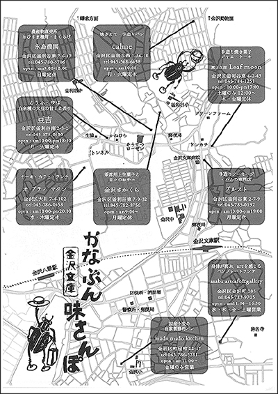 マップは以下の掲載各店舗で配布。▽永島農園(釜利谷東)/農産物直売所▽calme(釜利谷西)/手造りパン▽Leaf moon(釜利谷東)/焼き菓子・ケーキ▽豆吉(釜利谷東)/とうふ・ゆば▽オプティマタン(大川)/ケーキ・カフェ▽金沢さかくら(釜利谷東)/上生菓子▽ブルスト(釜利谷東)/手作りソーセージ・ハム▽asaba artcafe&gallery(金沢町)/ベジプレートランチ▽mado mado kitchen(町屋町)/酵母パン