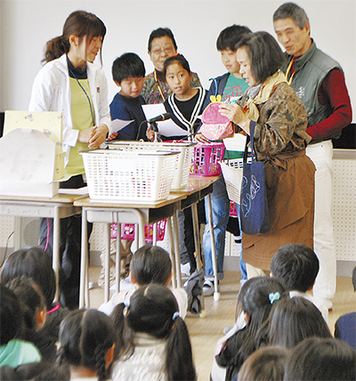 この日は、メンバー全員の10人が参加。認知症が脳の病気であることや、全国に予備軍を含めて約800万人の患者がいることなどを説明した。日付や足し算、料理など簡単なことが分からなくなるという言葉に、児童は真剣に耳を傾けていた。また、後出しで勝つジャンケンゲームなどを交え「瞬時に判断ができなくなる状態」の理解を求めた。