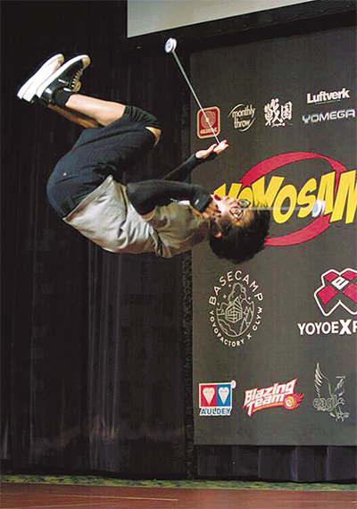 音楽に合わせて2つのヨーヨーを操り、アクロバット技で魅せるのが最大の武器。4年前のWYYCで初めて、成功した。今年は「男らしいかっこよさ」を表現するためロッキーのテーマに合わせ、バク宙や前方半捻りを披露した。昨年は団体でこそ優勝しているものの「勝ちたい気持ちが強すぎて空回り。今年は楽しもうと臨み、技が全て決まった時はほっとした」と高田さん。優勝の瞬間は、ライバル関係なく歓声が送られたという。「世界中の人と技で交流できる。一瞬で輪が広がるのが魅力」と笑顔を見せる。
